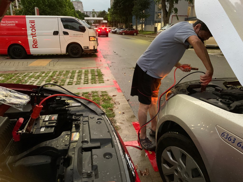 说开了一夜的hazard lights,只要jump start 即可